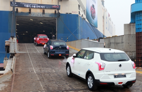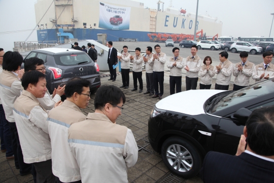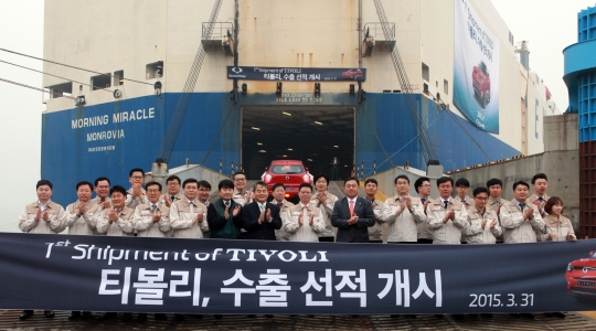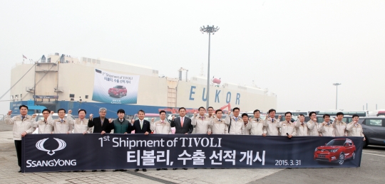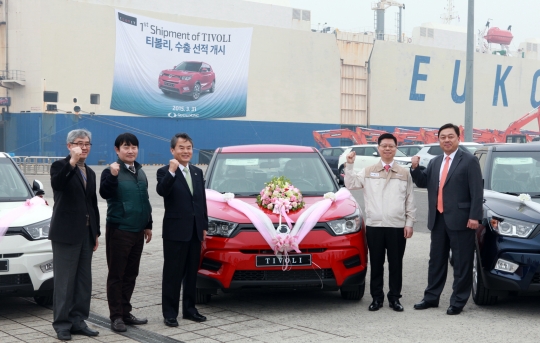 쌍용자동차 설동철 해외영업본부장(오른쪽 두 번째), 평택국제자동차부두 김학수 대표(오른쪽 세 번째), EUKOR사 김재수 이사(오른쪽 첫 번째) 등 관계자들이 티볼리 선적 1호 차량 옆에서 포즈를 취하고 있다.