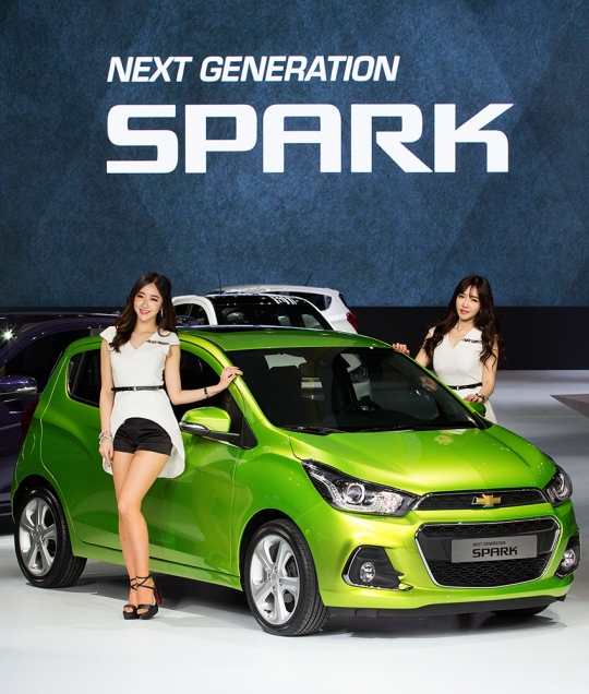 쉐보레는 2일 일산 킨텍스에서 열린 서울모터쇼 프레스데이를 통해 차세대 쉐보레 스파크를 첫 공개했다. 이날 공개된 차세대 스파크 앞에서 모델들이 포즈를 취하고 있다.