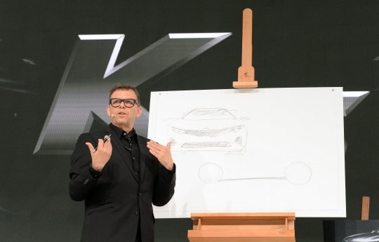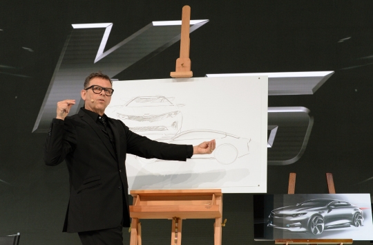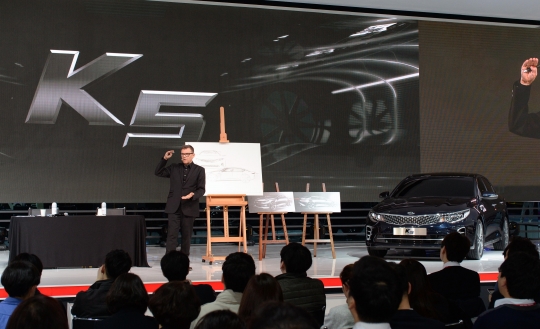 2일 일산 킨텍스에서 열린 서울모터쇼 프레스데이 행사에서 피터 슈라이어 현대기아차 디자인 총괄사장이 신형 K5의 디자인을 소개하고 있다.