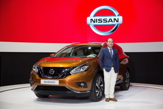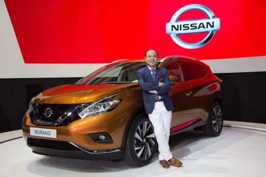 2일 일산 킨텍스에서 열린 서울모터쇼 언론행사에서 타케히코 키쿠치 한국닛산 대표(오른쪽)가 신형 무라노 차량에 기대고 있다.
