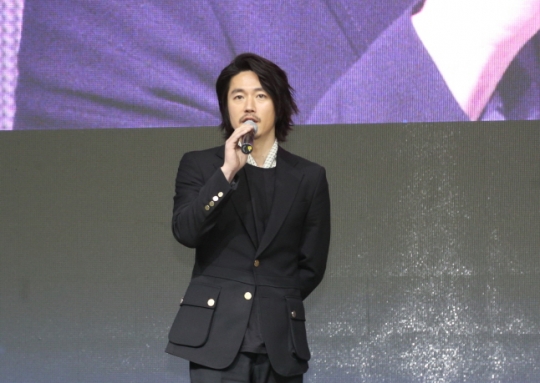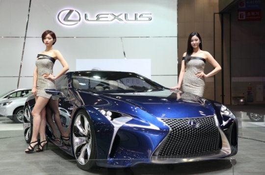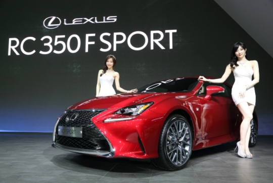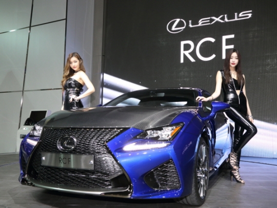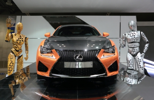 2일 일산 킨텍스에서 열린 서울모터쇼 언론행사에서 렉서스 신차 RC 홍보대사인 배우 장혁씨(왼쪽)가 요시다 아키히사 한국토요타 사장과 주먹을 쥐어 보이고 있다.