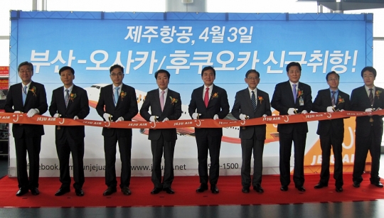 3일 김해국제공항 열린 취항식에서 제주항공 최규남 대표이사(왼쪽에서 다섯 번째)와 관계자들이 테이프를 자르고 있다.