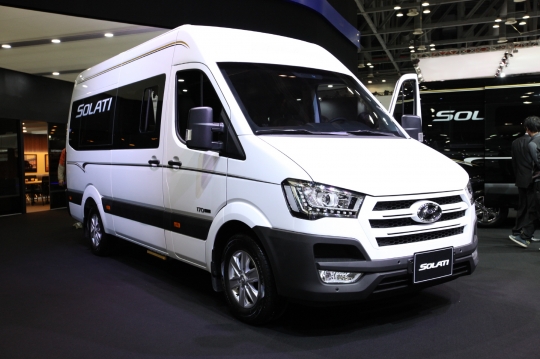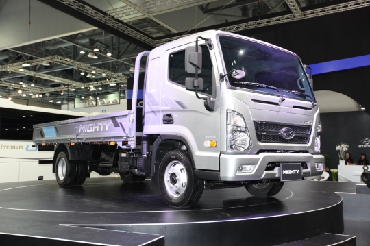 현대차 상용관에서는 17년 만에 새롭게 태어난 중형트럭 '올 뉴 마이티(Mighty)' 4대와 유러피언 프리미엄 미니버스 '쏠라티(SOLATI, H350)' 3대 등 완성차 12대와 신기술 3종을 전시한다.