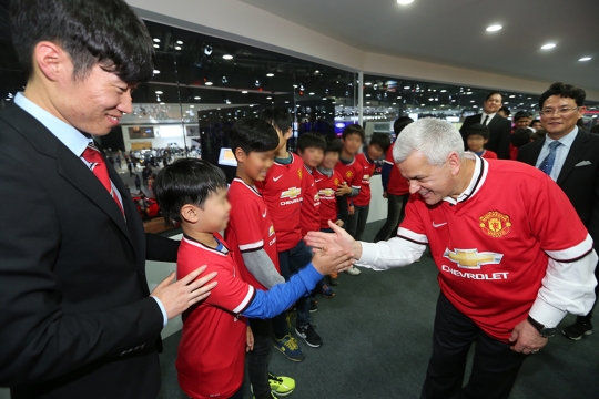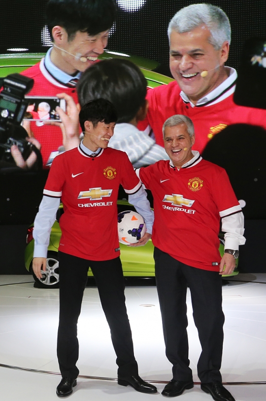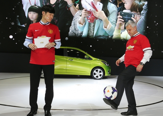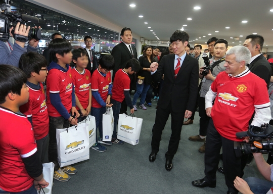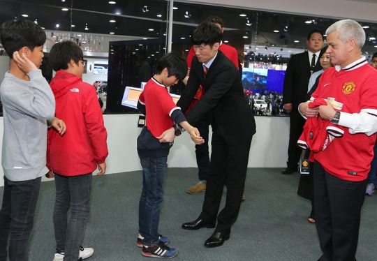 지난 4일 일산 킨텍스 서울모터쇼 쉐보레 부스에 맨체스터 유나이티드 엠버서더 박지성(왼쪽)이 방문해 세르지오 호샤 한국지엠 사장과 함께 관람객들을 대상으로 이벤트를 진행했다.