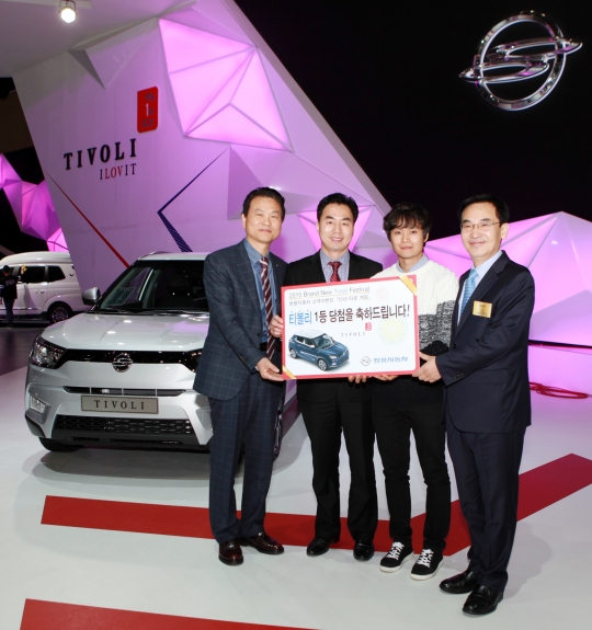 4일 서울모터쇼가 열린 일산 킨텍스 내 쌍용차 부스에서 송영한 쌍용차 국내영업본부장(왼쪽 네 번째)이 'Brand New 2015 티볼리 페스티벌' 1등에 당첨된 김정우씨(왼쪽 세 번째)에게 경품을 전달하고 있다.