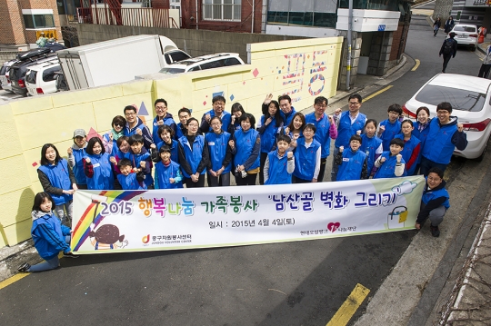 현대오일뱅크 임직원 가족들이 4일 서울 필동 남산골에서 벽화 그리기 봉사 후 기념사진을 찍고 있다.