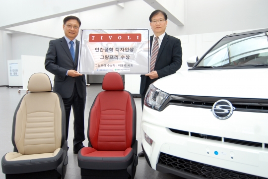 쌍용자동차 차량개발센터 이수원 전무(오른쪽)와 대원강업 구재광 상무가 티볼리 시트 뒤에서 기념촬영을 하고 있다.