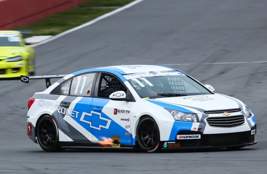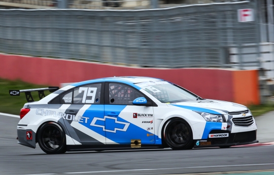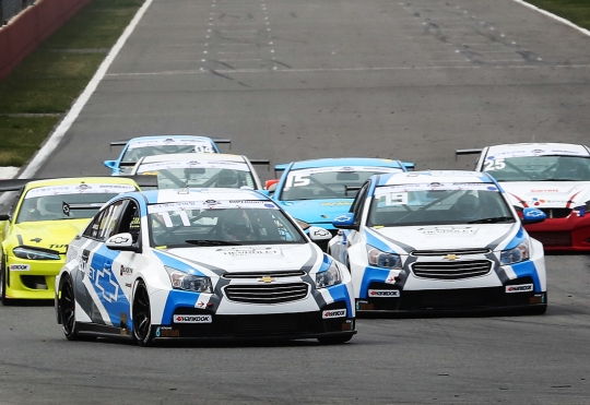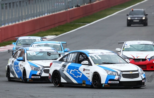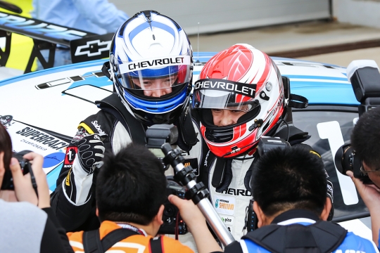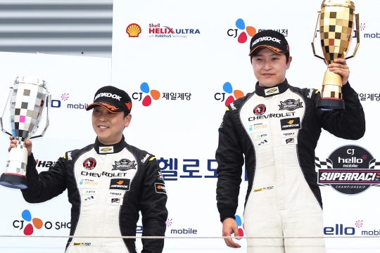 쉐보레 레이싱팀 이재우 감독(가운데 왼쪽)과 안재모 선수(가운데 오른쪽)가 12일 전남 영암 코리아 인터내셔널 서킷에서 열린 '2015 CJ 헬로모바일 슈퍼레이스 챔피언십' 개막전에 출전해 경기 전 화이팅을 외치고 있다.