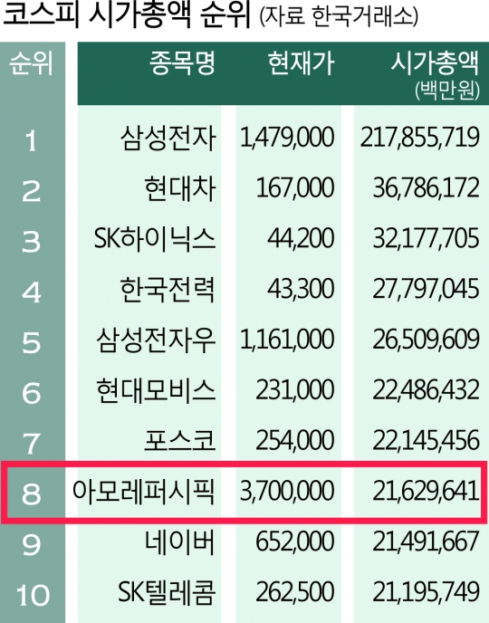 황제주로 등극한 아모레퍼시픽이 네이버와 SK텔레콤을 제치고 시가총액 순위 8위까지 올라섰다.