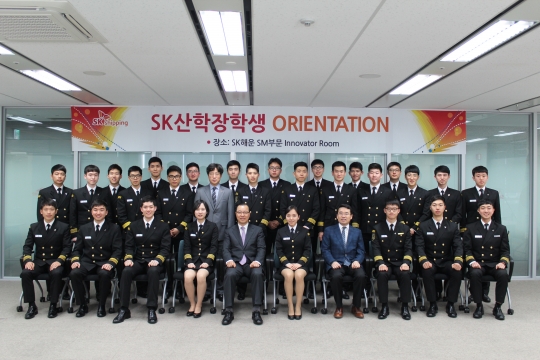 10일 부산 트레이닝센터에서 열린 산학장학 증서 수여식에서 강석환 SK해운 SM부문장(앞줄 왼쪽에서 다섯 번째)이 장학생들과 함께 기념촬영을 하고 있다.