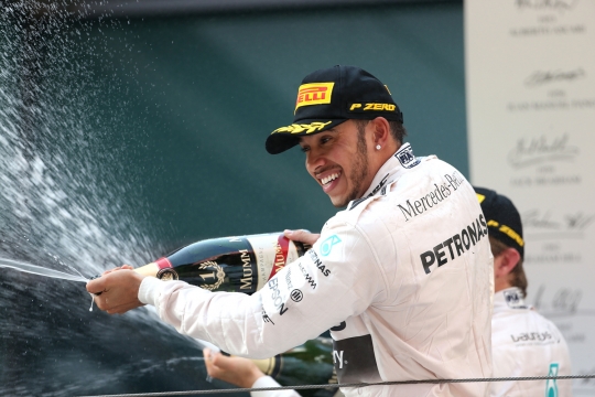 메르세데스 AMG 페트로나스 F1 팀 드라이버 루이스 해밀턴이 승리를 자축하고 있다.