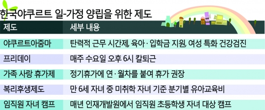 매주 수요일이면 한국야쿠르트는 유독 빨리 불이 꺼진다. 프리데이(Free Day)로 정해 오후 6시면 모든 직원이 바로 퇴근하도록 야근이나 저녁 회식을 금지했다. 일찍 귀가해 가족과 함께 시간을 보내기 위한 제도다.