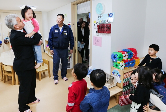 한국지엠 세르지오 호샤 사장(왼쪽)과 정종환 노조위원장(왼쪽 두 번째)이 16일 부평 어린이집을 방문했다.