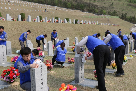 효성의 대구, 경북지역 4개 사업장이 경상북도 영천시에 위치한 국립영천호국원과 1사1묘역 자매결연 협약을 28일 맺고 묘지 환경정화를 실시하고 있다. / 효성 제공