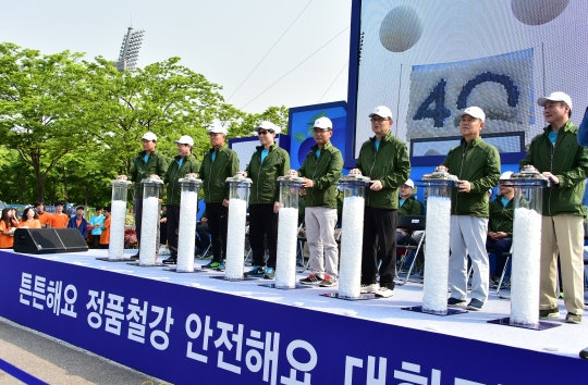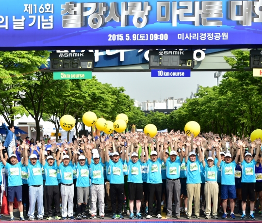 9일 경기도 하남시 미사리 경정공원에서 열린 철강사랑 마라톤 대회에 (왼쪽에서 네 번째부터) TCC동양 손봉락 회장, 고려제강 홍영철 회장, 산업통상자원부 김용래 소재부품정책관, 현대제철 강학서 사장, 한국철강협회 권오준 회장, 한국철강협회 오일환 상근부회장, 동국제강 남윤영 사장, 세아제강 이휘령 사장이 참석했다.