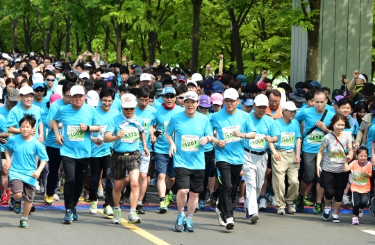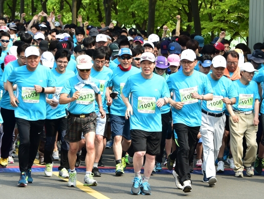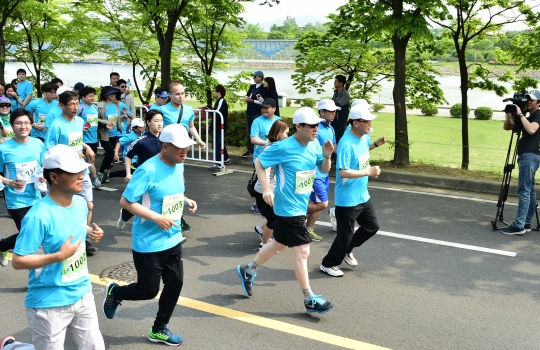 9일 경기도 하남시 미사리 경정공원에서 열린 철강사랑 마라톤 대회에 참가한 권오준 포스코 회장(가운데) 등 철강업계 관계자들이 달리고 있다.