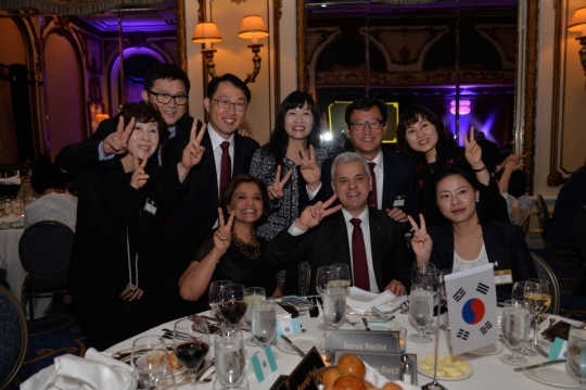 10일 미국 샌프란시스코에서 열린 '2015그랜드 마스터' 시상식에 참석한 국내 최우수 딜러, 대리점 및 서비스센터 대표들이 세르지오 호샤 한국지엠 사장(앞줄 오른쪽에서 두 번째)와 그의 부인 네이바 호샤(호샤 사장 왼쪽)와 함께 포즈를 취하고 있다.