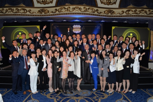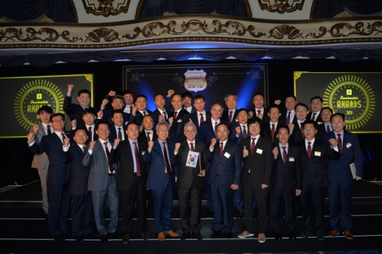 10일 미국 샌프란시스코에서 열린 '2015그랜드 마스터' 시상식에 참석한 GMI와 GM 차이나 내 최우수 딜러, 대리점 및 서비스센터 대표들이 배우자와 함께 포즈를 취하고 있다. 중앙 앞에서 두 번째 열이 세르지오 호샤 한국지엠 사장, 호샤 사장의 오른쪽 대각선 위가 스테판 자코비 GMI 사장이다.