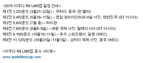 요그 디잇츨 아우디 코리아 이사는 "지난해 영암에서 열렸던 2014 R8 LMS컵 대회에서 팀 아우디 코리아 유경욱 선수는 19번째 위치에서 출발해 4위로 결승점을 통과하는 최고의 추월 레이싱을 펼쳤다"며 "올해 홈경기에서도 유 선수의 멋진 선전을 기원하며, 이번 대회가 한국 모터스포츠 산업 발전에 기여할 수 있기를 바란다"고 말했다.