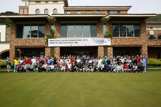 11일 경기도 광주 이스트밸리에서 열린 BMW 골프컵 인터내셔널 2015 대회 참가자들이 단체사진을 찍고 있다.