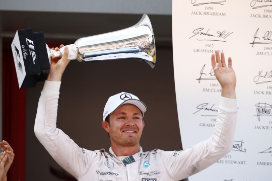 2015 F1 스페인 그랑프리 우승을 차지한 니코 로즈버그가 트로피를 들고 있다.