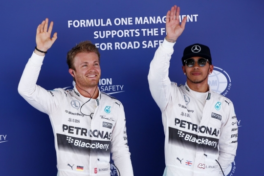 2015 F1 스페인 그랑프리에서 원투피니시를 기록한 니코 로즈버그(왼쪽)와 루이스 해밀턴이 손을 흔들고 있다.