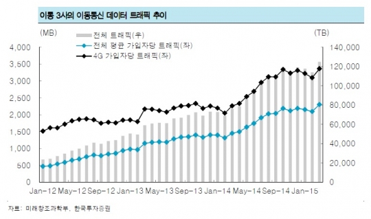 2012년부터 올해 1월까지 이통 3사 이동통신 데이터 트래픽 추이 /한국투자증권 제공