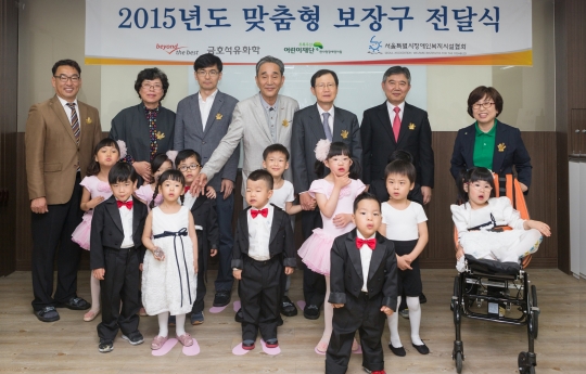 19일 경기 광주 한사랑장애영아원을 찾은 박찬구 금호석유화학 회장(오른쪽 세 번째)이 오른쪽부터 두 번째 김성채 금호석유화학 사장, 네 번째 김원제 서울시장애인복지시설협회장, 다섯 번째 윤재삼 서울시 장애인복지정책과장과 함께 깜짝 공연을 선물한 아이들과 기념촬영을 하고 있다.
