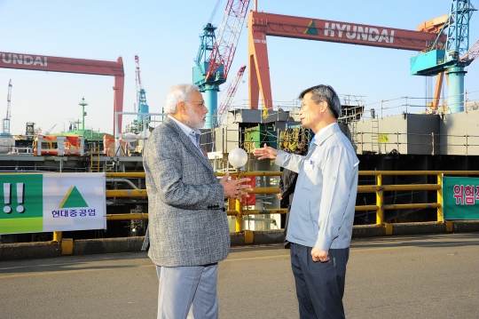 나렌드라 모디 인도 총리(왼쪽)와 최길선 현대중공업 회장이 19일 울산조선소 선박건조 현장에서 환담을 나누고 있다.