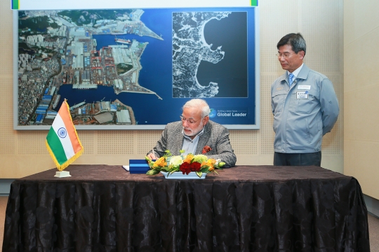 나렌드라 모디 인도 총리(왼쪽)가 19일 울산 현대중공업 사내 회의실에서 방명록을 작성하는 모습을 최길선 현대중공업 회장이 바라보고 있다.