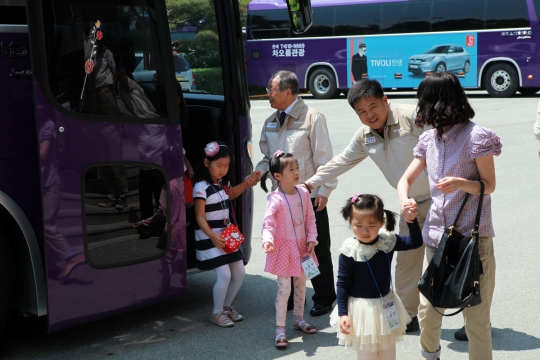 20일 쌍용차 최종식 대표이사(버스 옆)와 문제형 노동조합 수석부위원장(가운데)이 평택공장에서 임직원 가족들을 맞이하고 있다.