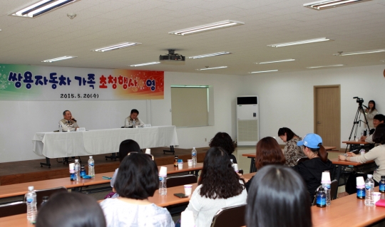 20일 쌍용차 평택공장에서 최종식 대표이사(강단 왼쪽)와 문제형 노동조합 수석부위원장(강단 오른쪽)이 임직원 가족들과 대화를 나누고 있다.