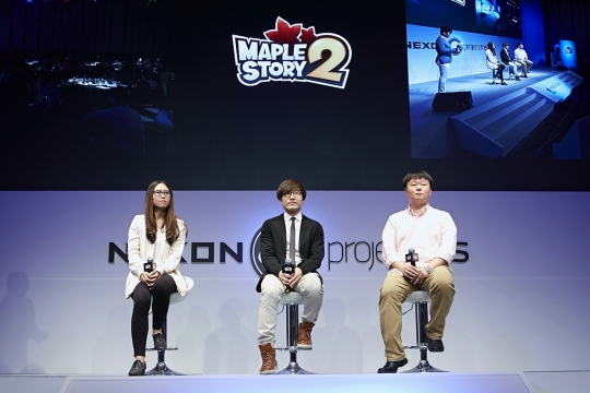 메이플스토리2 미디어 쇼케이스에 질의 응답 중인 (왼쪽부터) 오미영 게임 디자인 팀장, 김진만 디렉터, 장성경 사업실장/넥슨 제공