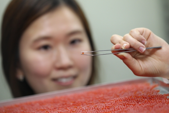 KT&G는 벤처기업 '에이티랩'과 공동으로 국내 최초 담배필터용 '심리스 향캡슐' 개발에 성공함으로써 외화를 절감한 것은 물론, 수백억원으로 추정되는 향 캡슐 시장에 에이티팹이 본격 진출할 수 있는 성장의 발판을 마련했다. 사진은 KT&G 기술연구소에서 품질관리 사원들이 향캡슐을 선별하는 모습./ KT&G제공