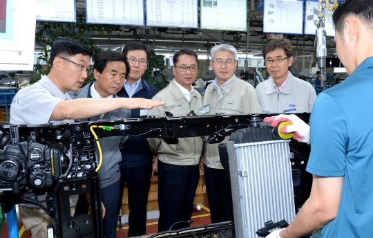 현대모비스 아산모듈공장을 찾은 협력사 임직원들이 공장 관계자의 설명을 들으며 라인을 견학하고 있다.