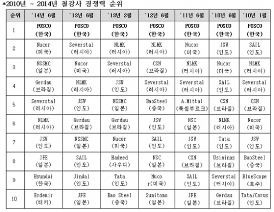 이날 발표된 상위 5개 기업에는 셰일가스 개발 수혜를 얻고 있는 미국의 뉴코어(2위), 아베노믹스로 수출 경쟁력이 높아진 신일철주금(3위), 남미 대표 철강사인 게르다우(4위), 러시아 대표 철강사 세베르스탈(5위)이 선정됐다. 현대제철은 지난해에 이어 올해도 9위에 올랐다.