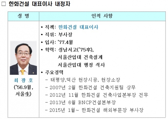 한화건설 대표이사에는 해외부문장 겸 BNCP 건설본부장인 최광호 부사장을 내부 발탁했다.