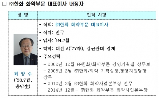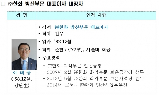 ㈜한화 화약부문 대표이사에는 ㈜한화 화약사업본부장 최양수 전무를, ㈜한화 방산부문 대표이사에는 ㈜한화 방산사업본부장 이태종 전무를 발탁 내정했다.