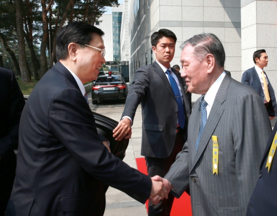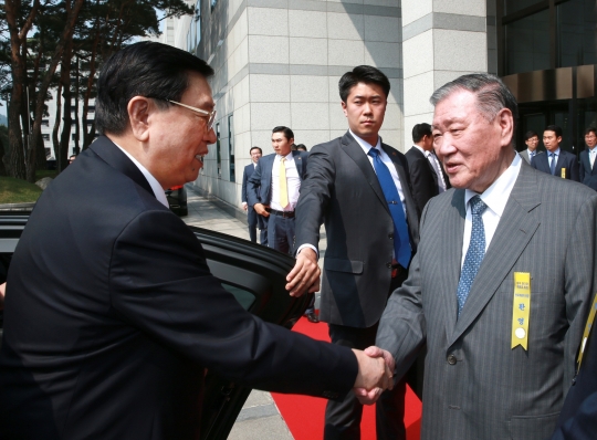12일 서울 양재동 현대차그룹 사옥을 방문한 장더장 상무위원장(왼쪽)이 정몽구 현대차그룹 회장과 악수하고 있다..
