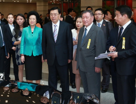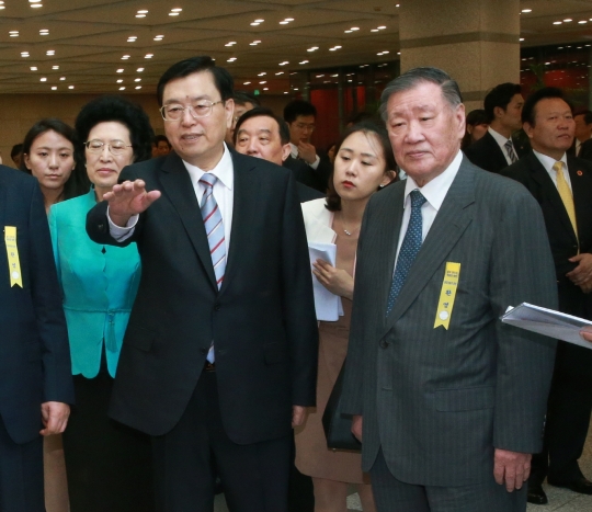 12일 정몽구 현대차그룹 회장(가운데 오른쪽)과 장더장 상무위원장(중앙 좌측)이 서울 양재동 현대차그룹 사옥 내 전시된 차량들을 둘러보고 있다