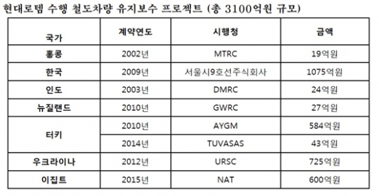 현대로템은 국내를 비롯해 인도, 뉴질랜드, 홍콩, 터키, 이집트 등에서 전동차 유지보수 업무를 수행하고 있다.