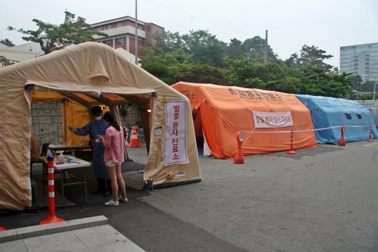 서울지역 메르스 국민안심병원으로 지정된 서울 고대구로병원에서 병원 관계자들이 병원을 찾은 환자들 및 시민들을 대상으로 출입시 메르스 체크리스트 확인과 발열 감지를 하고 있다.
