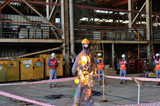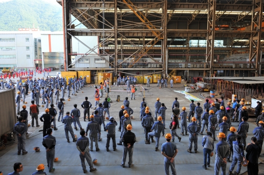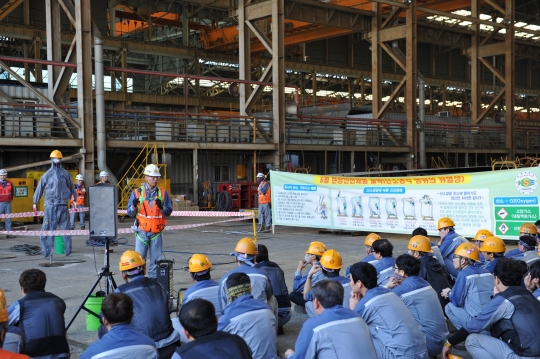 26일 성동조선해양이 경남 통영조선소에서 현장근로자를 대상으로 체험식 안전교육을 실시하고 있다.