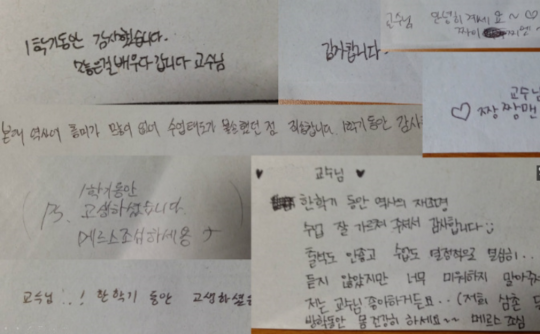감성을 자극하는 낙서들도 있었다. "한학기동안 고생하셨습니다. 메르스 조심하세요", "1학기 동안 감사했습니다. 많은걸 배우다 갑니다 교수님", "교수님 짱짱맨" 등 조 교수를 생각해주는 글귀도 보였다.