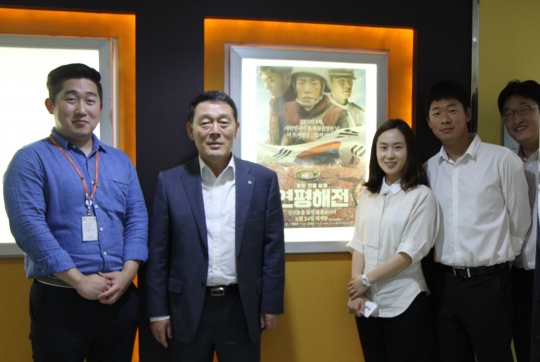 이태종 한화 방산부문 사장(왼쪽 두 번째)이 연평해전 영화시작 전 직원들과 극장에서 기념촬영을 하고 있다.
