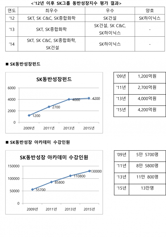 SK그룹은 최근 정부 동반성장위원회가 112개 대기업을 대상으로 발표한 '2014년도 동반성장지수 평가' 에서 SK텔레콤과 SK종합화학, SKC&C, SK건설 등 총 4개사가 최우수 등급을 받았다.