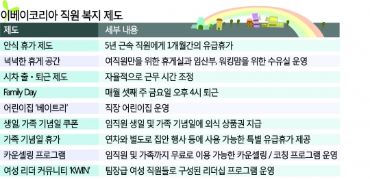 이베이코리아는 또한 아이를 학교에 보내거나 다른 보육원에 맡기는 워킹맘을 위해 '시차 출퇴근 제도'를 도입했다. 8시부터 10시 사이 출근시간을 직원이 정할 수 있는 제도다. 이베이코리아에 근무하는 B씨는 이전 직장에서는 직장생활로 아이들이 학교에 가는 모습도 보지 못하고 출근했었지만 이베이코리아의 '시차 출퇴근 제도'로 매일 아침 아이들을 학교에 데려다 준 후 여유롭게 회사를 출근할 수 있게 됐다.