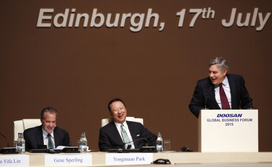 17일 영국 에든버러에서 열린 '2015 두산 글로벌 비즈니스 포럼'에서 고든 브라운 전 영국총리(오른쪽)의 연설 도중 박용만 두산그룹 회장(가운데)이 웃고 있다. 왼쪽은 진 스펄링 전 미국 국가경제회의(NEC) 의장.