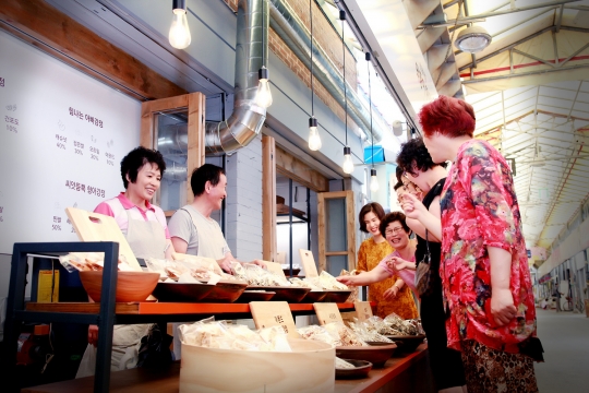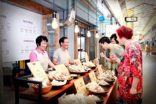 20일 대인시장 '막둥이한과' 이해성 사장 부부(왼쪽)가 새롭게 디자인된 점포에서 한과를 판매하고 있다.