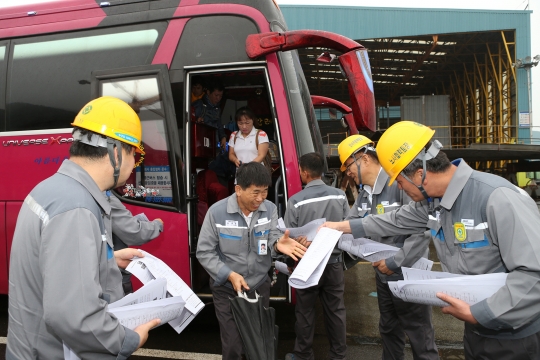 대우조선해양 옥포조선소 임원들이 출근하는 직원에게 결의문을 전달하고 있다. / 대우조선해양 제공